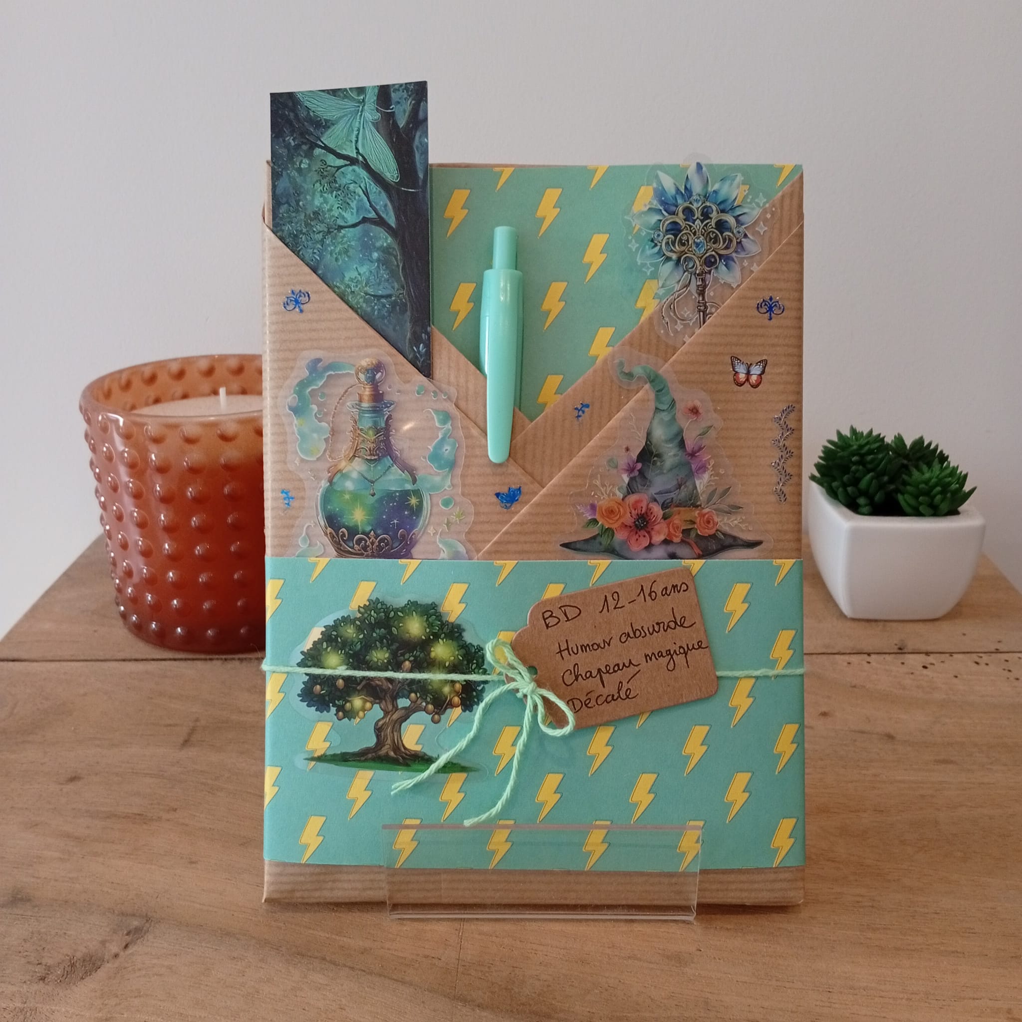 Un livre mystère, son marque-page et ses accessoires livresques (stylo, crayon, surligneur, stickers, onglets adhésifs, carte… Variable selon la box)