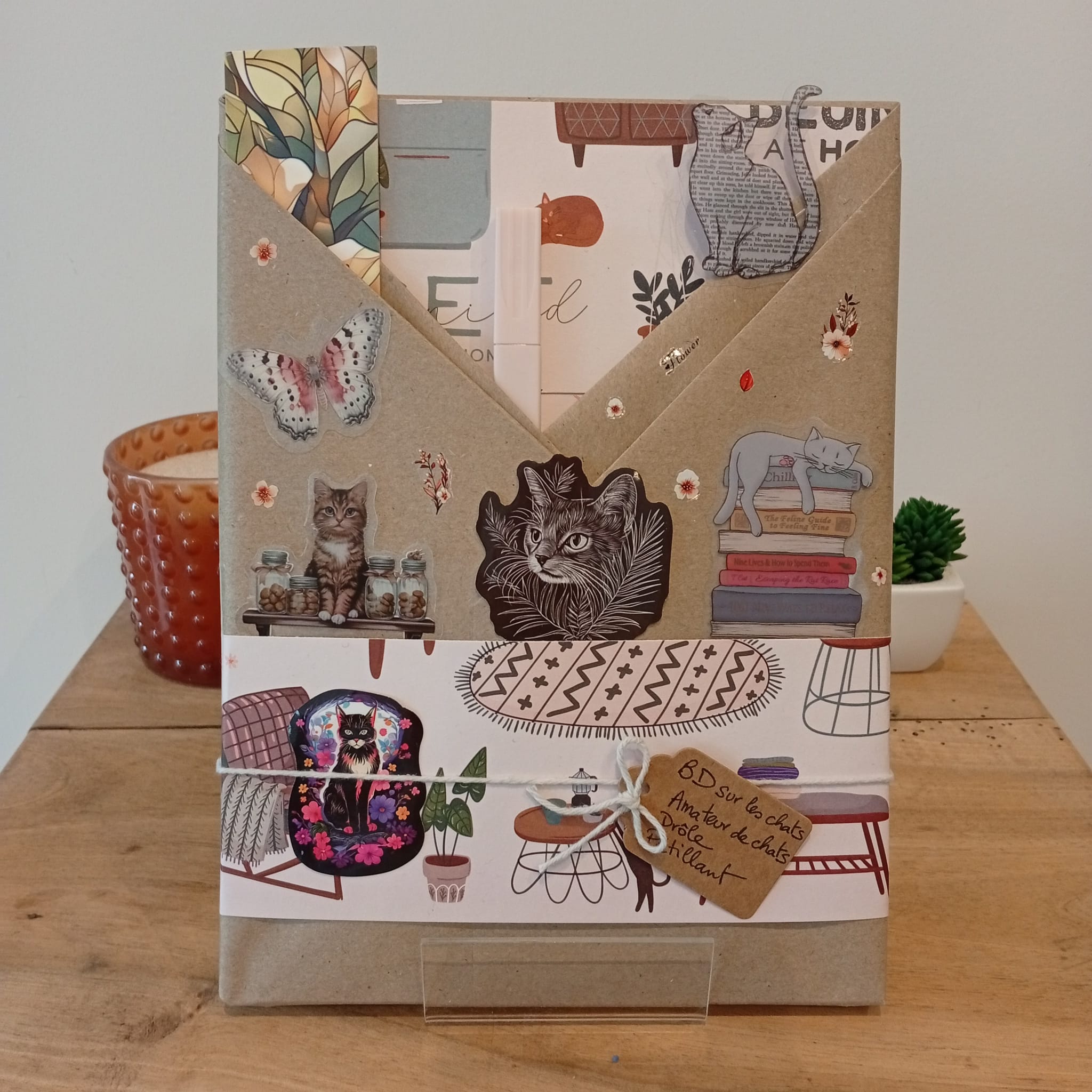 Un livre mystère format broché, son marque-page et ses accessoires livresques (stylo, crayon, surligneur, stickers, onglets adhésifs, carte… Variable selon la box)