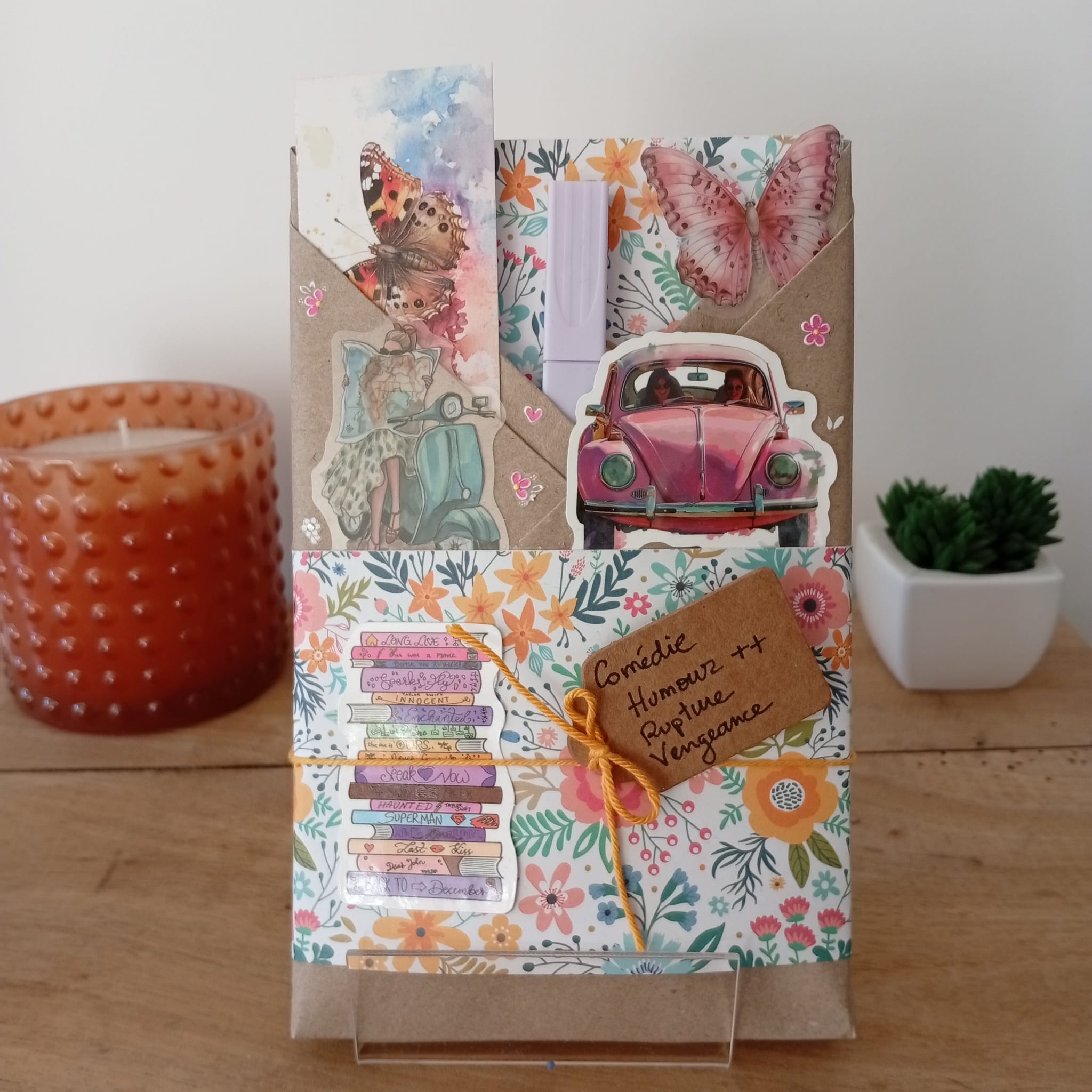 Box mystère : Un livre mystère format poche, son marque-page et ses accessoires livresques (stylo, crayon, surligneur, stickers, onglets adhésifs, carte… Variable selon la box)