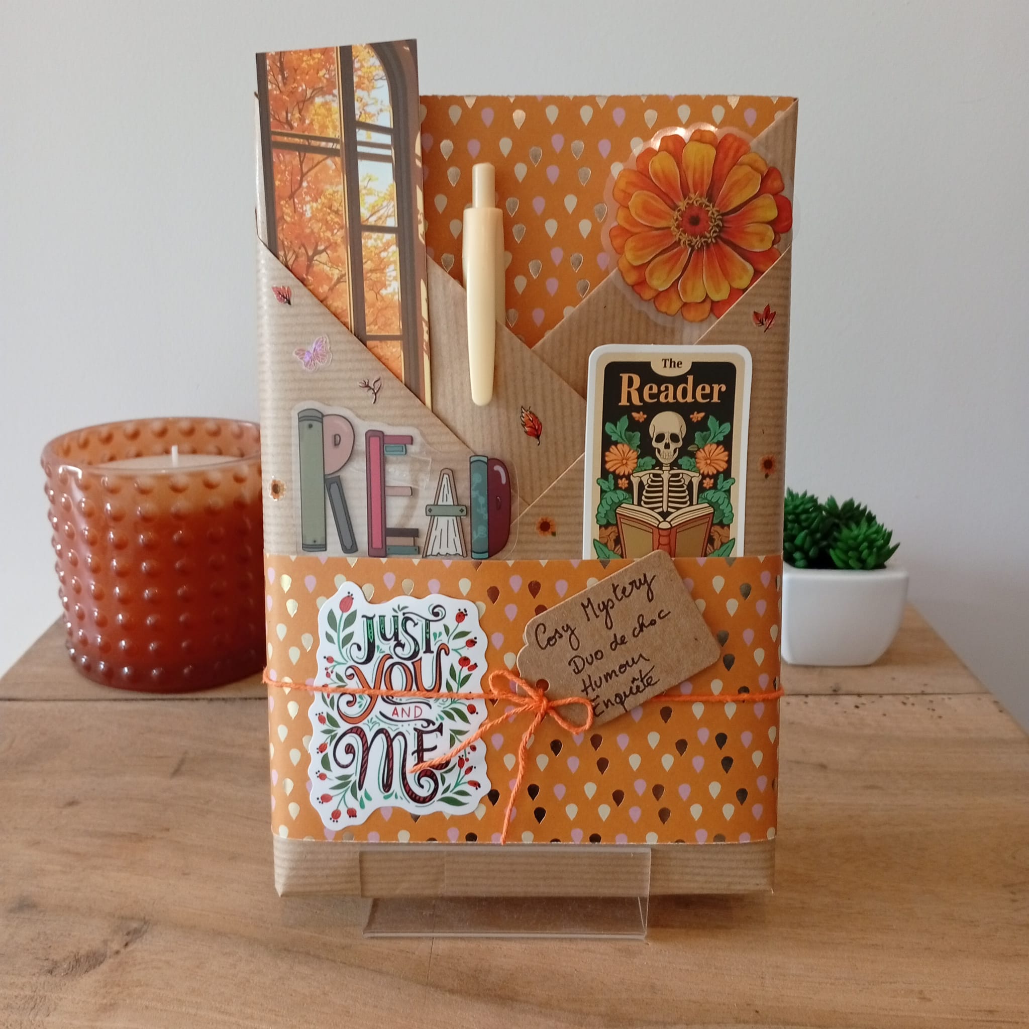 Un livre mystère format broché, son marque-page et ses accessoires livresques (stylo, crayon, surligneur, stickers, onglets adhésifs, carte… Variable selon la box)