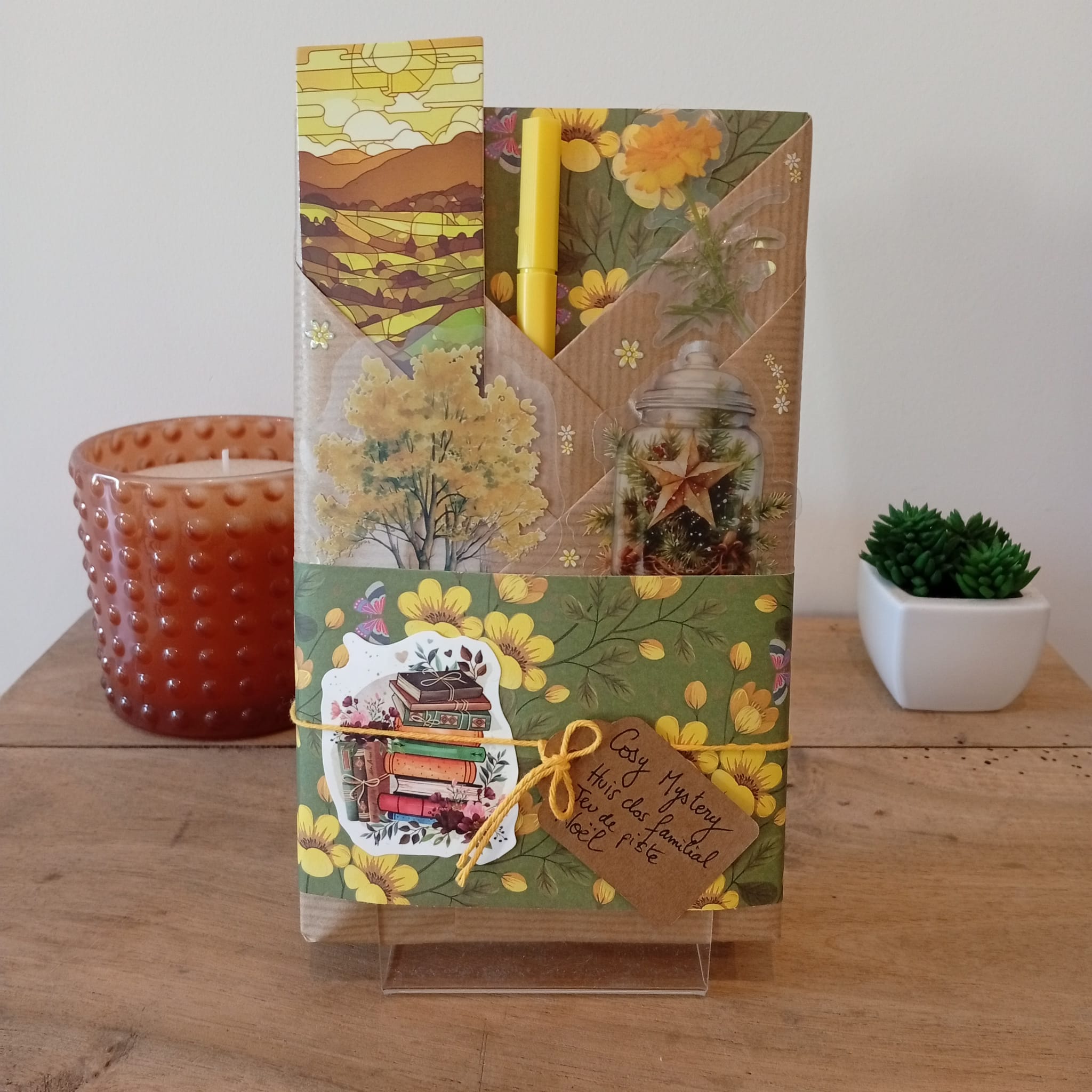 Un livre mystère format poche, son marque-page et ses accessoires livresques (stylo, crayon, surligneur, stickers, onglets adhésifs, carte… Variable selon la box)