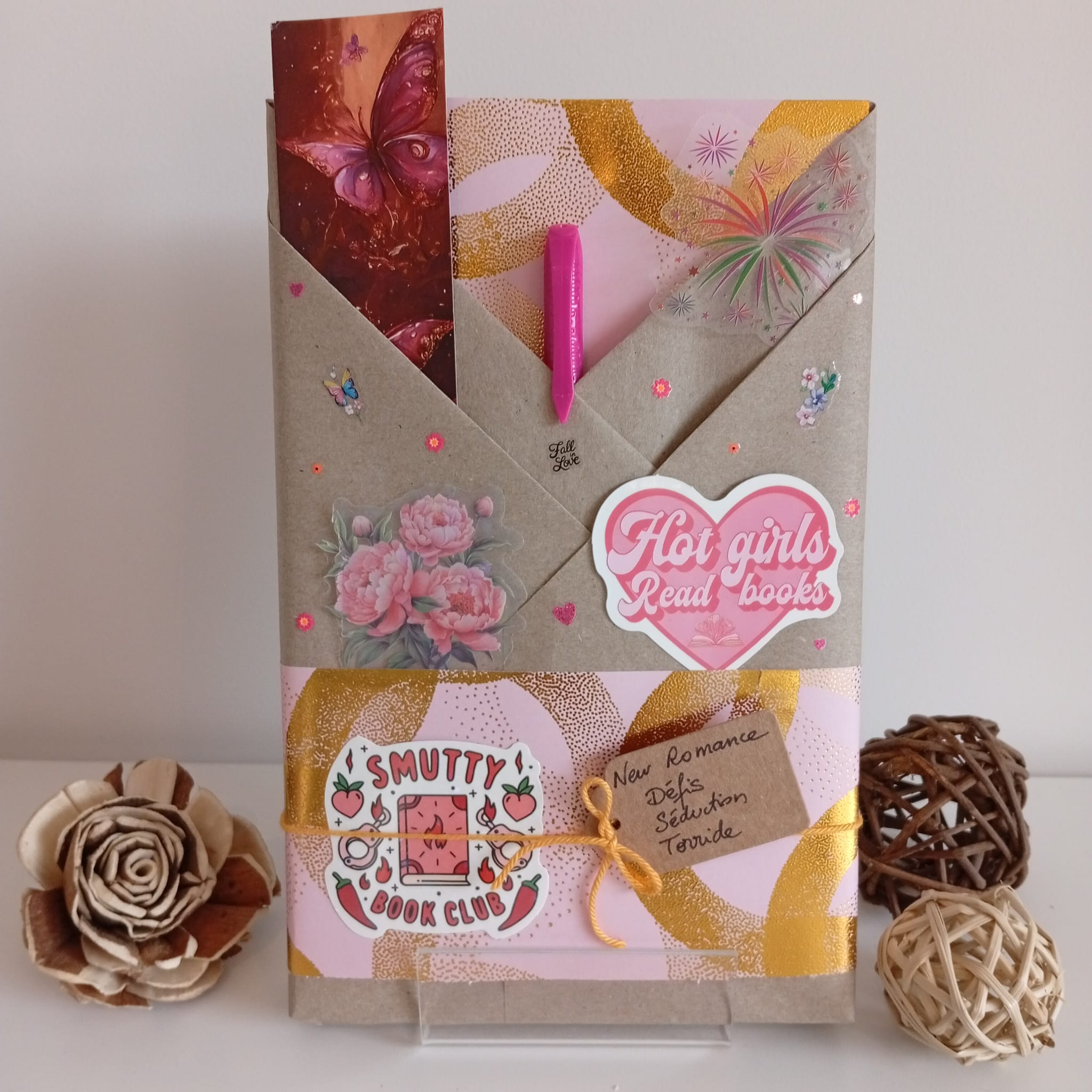 Un livre mystère format broché, son marque-page et ses accessoires livresques (stylo, crayon, surligneur, stickers, onglets adhésifs, carte… Variable selon la box)