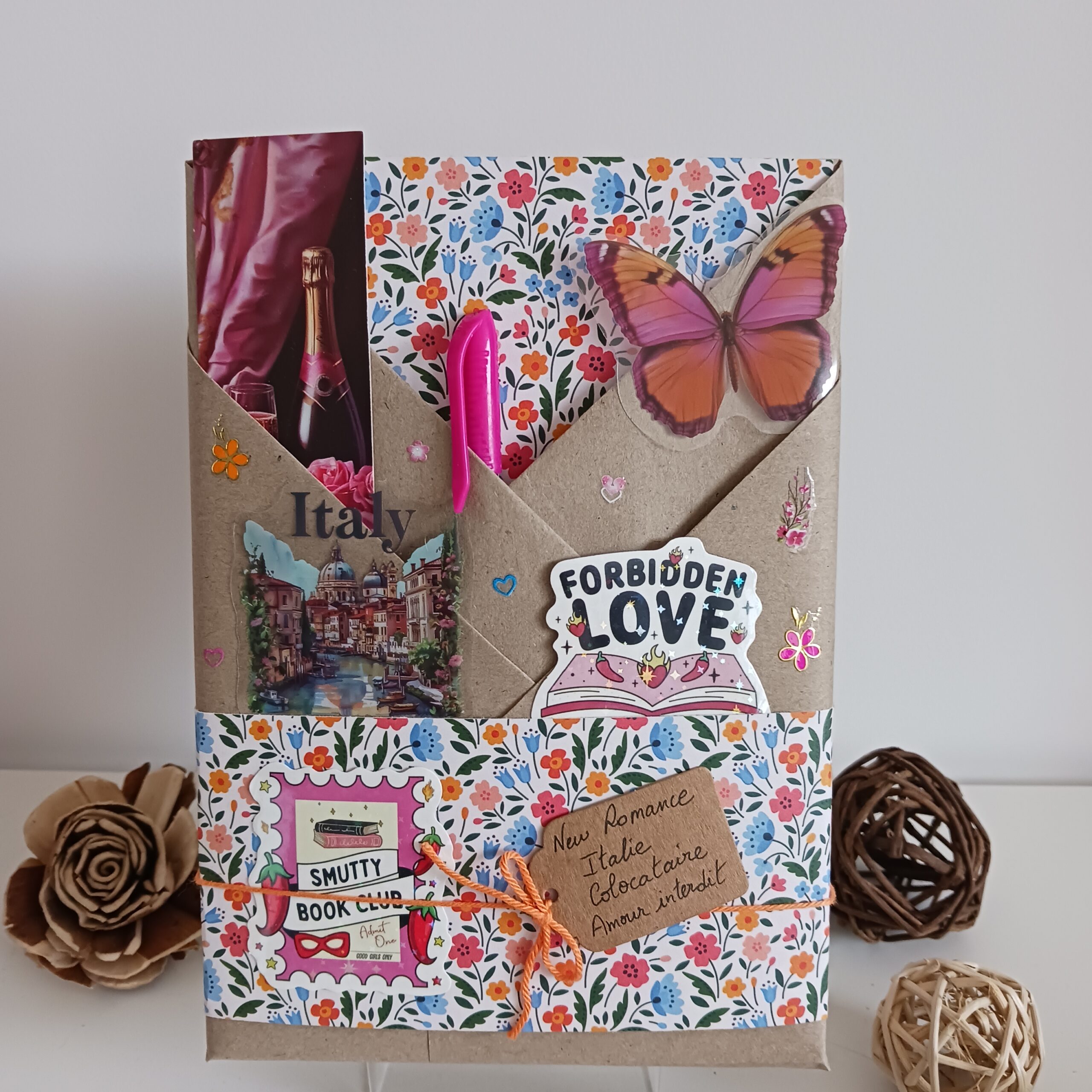 Un livre mystère format broché, son marque-page et ses accessoires livresques (stylo, crayon, surligneur, stickers, onglets adhésifs, carte… Variable selon la box)