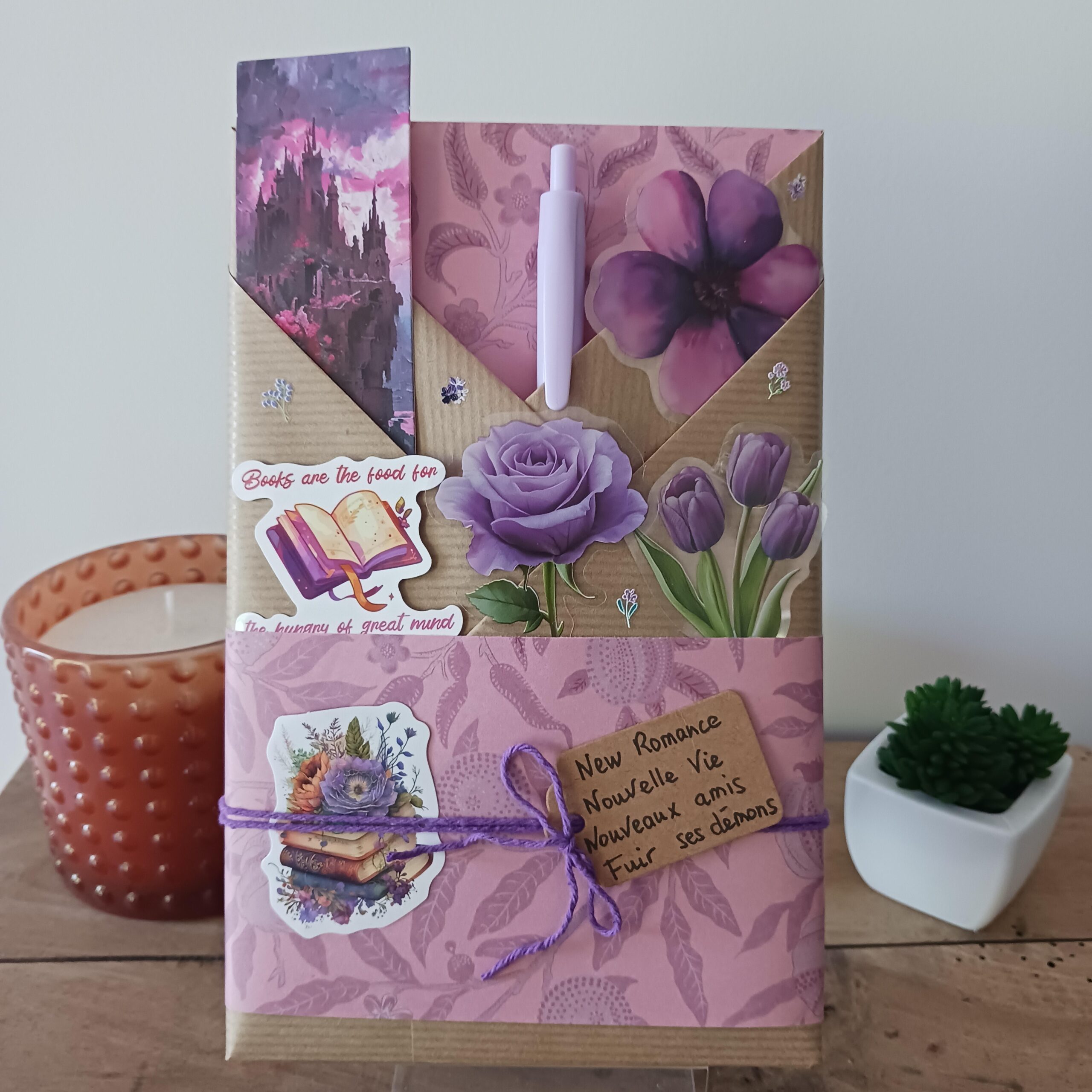 Un livre mystère format broché, son marque-page et ses accessoires livresques (stylo, crayon, surligneur, stickers, onglets adhésifs, carte… Variable selon la box)
