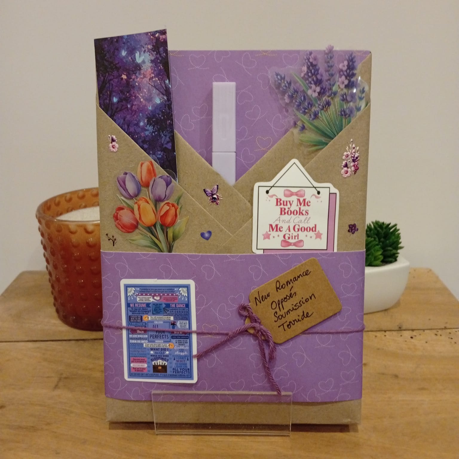 Un livre mystère format broché, son marque-page et ses accessoires livresques (stylo, crayon, surligneur, stickers, onglets adhésifs, carte… Variable selon la box)