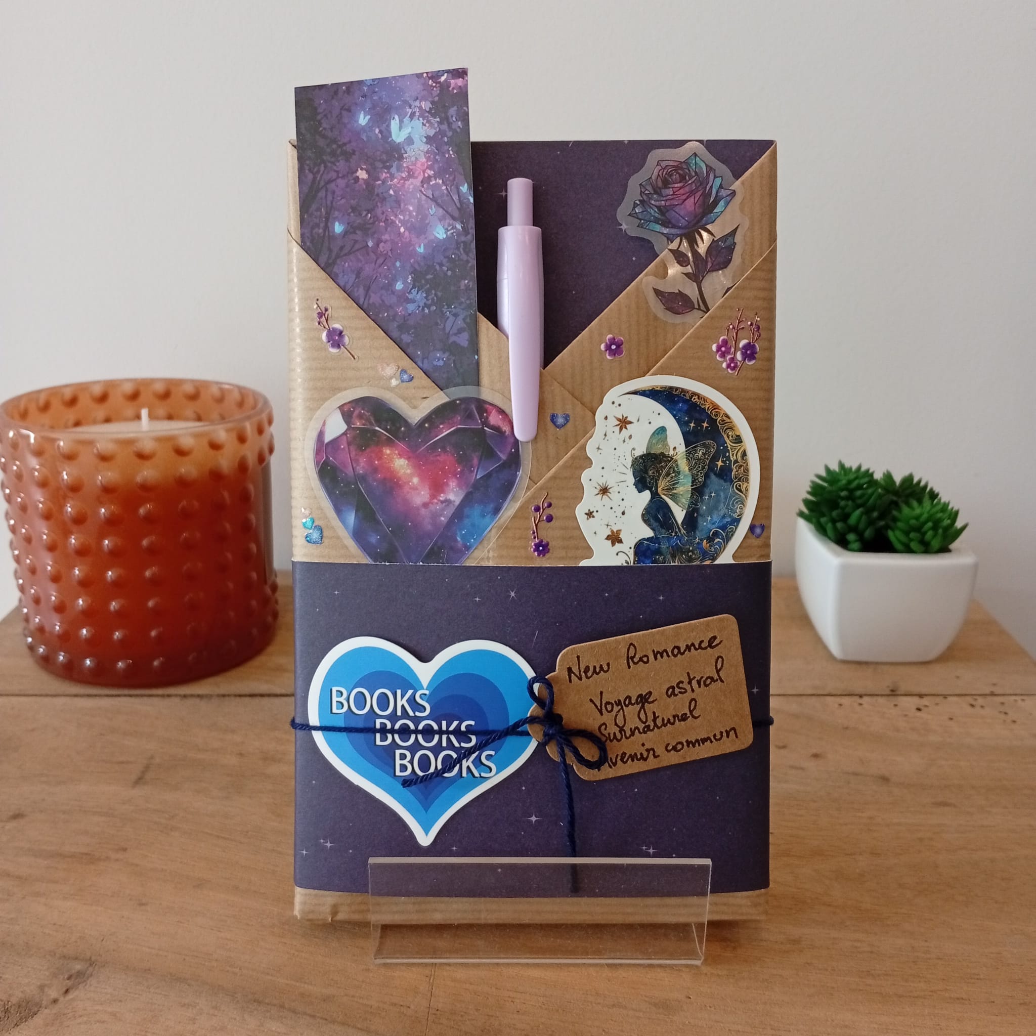 Un livre mystère format poche, son marque-page et ses accessoires livresques (stylo, crayon, surligneur, stickers, onglets adhésifs, carte… Variable selon la box)
