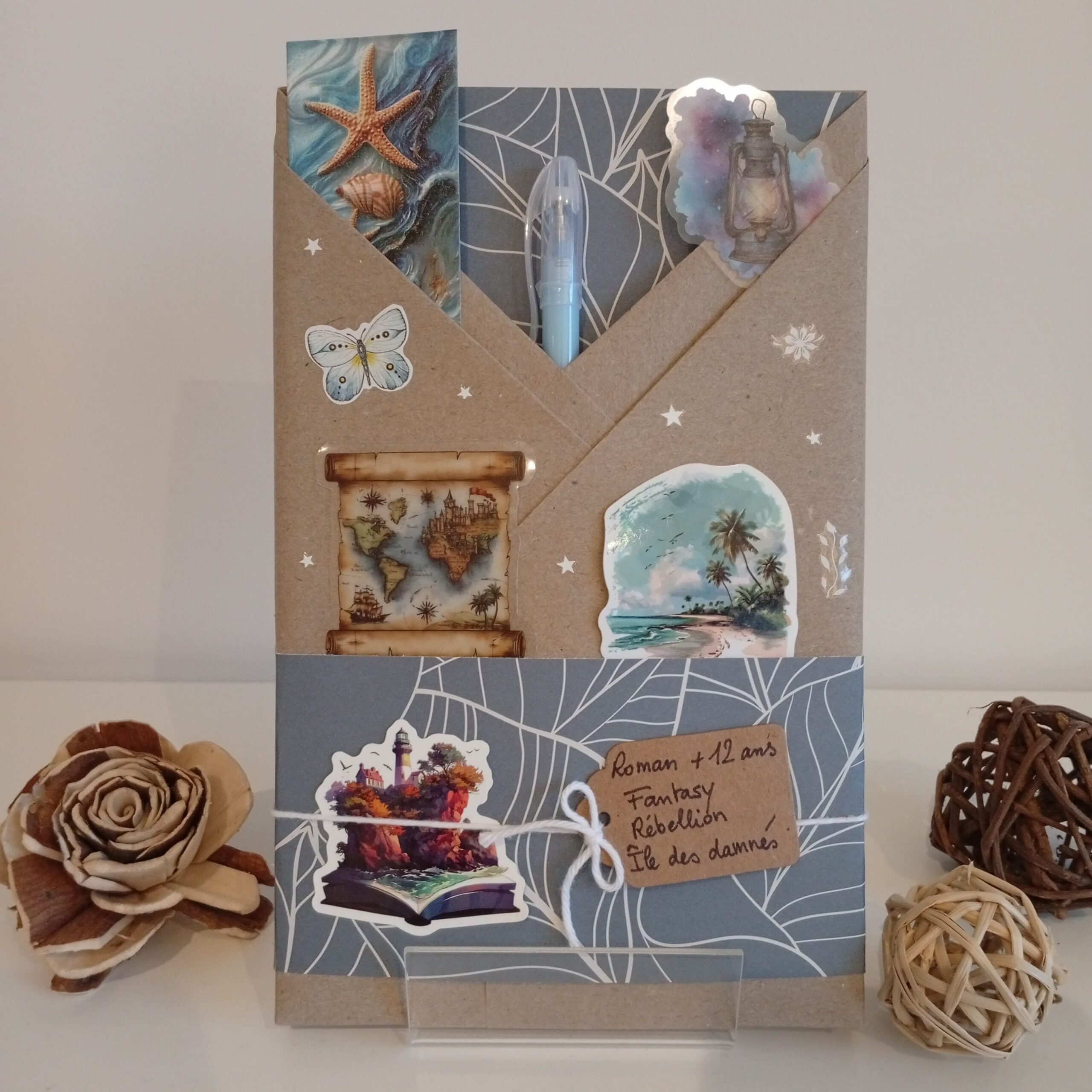 Un livre mystère format broché, son marque-page et ses accessoires livresques (stylo, crayon, surligneur, stickers, onglets adhésifs, carte… Variable selon la box)