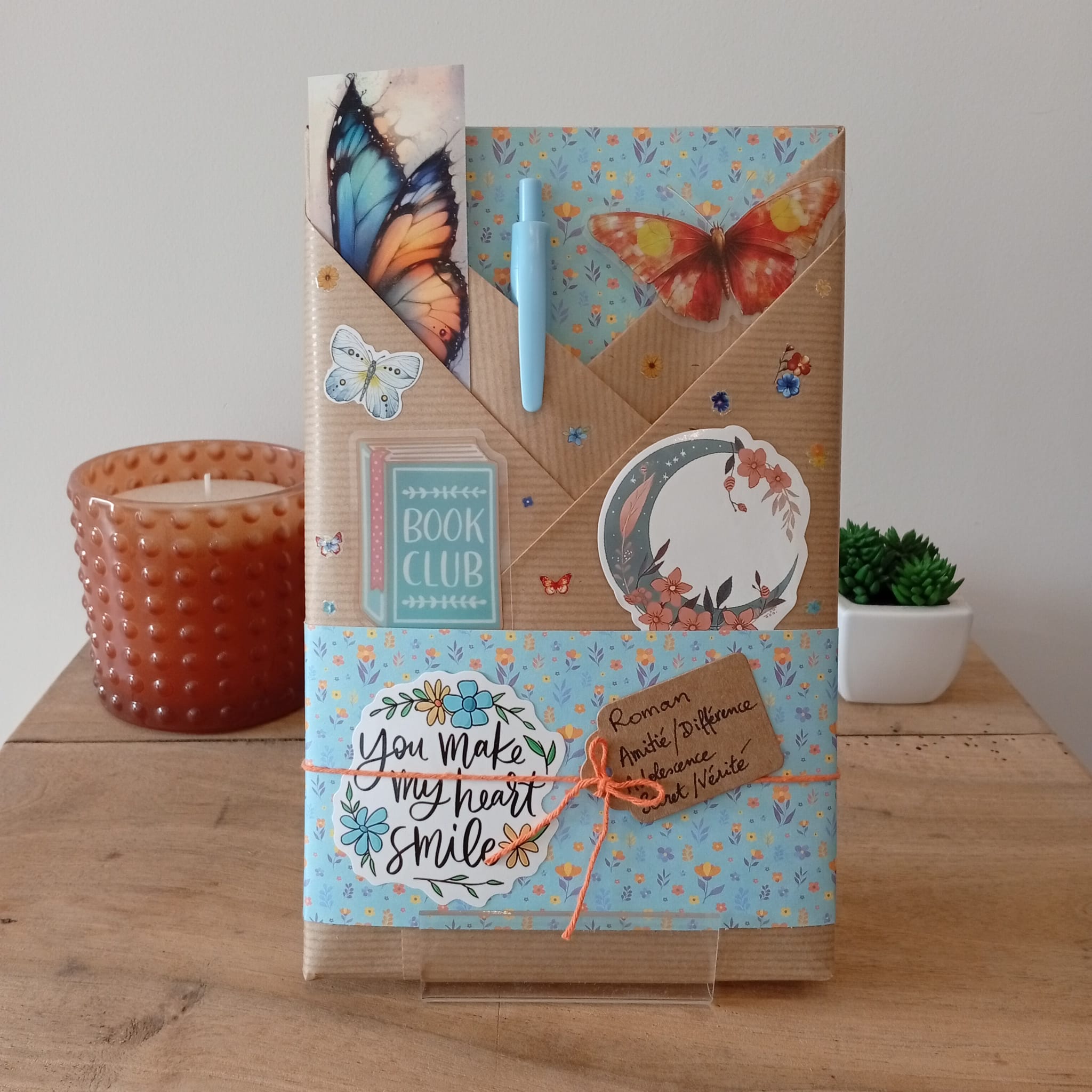 Un livre mystère format broché, son marque-page et ses accessoires livresques (stylo, crayon, surligneur, stickers, onglets adhésifs, carte… Variable selon la box)