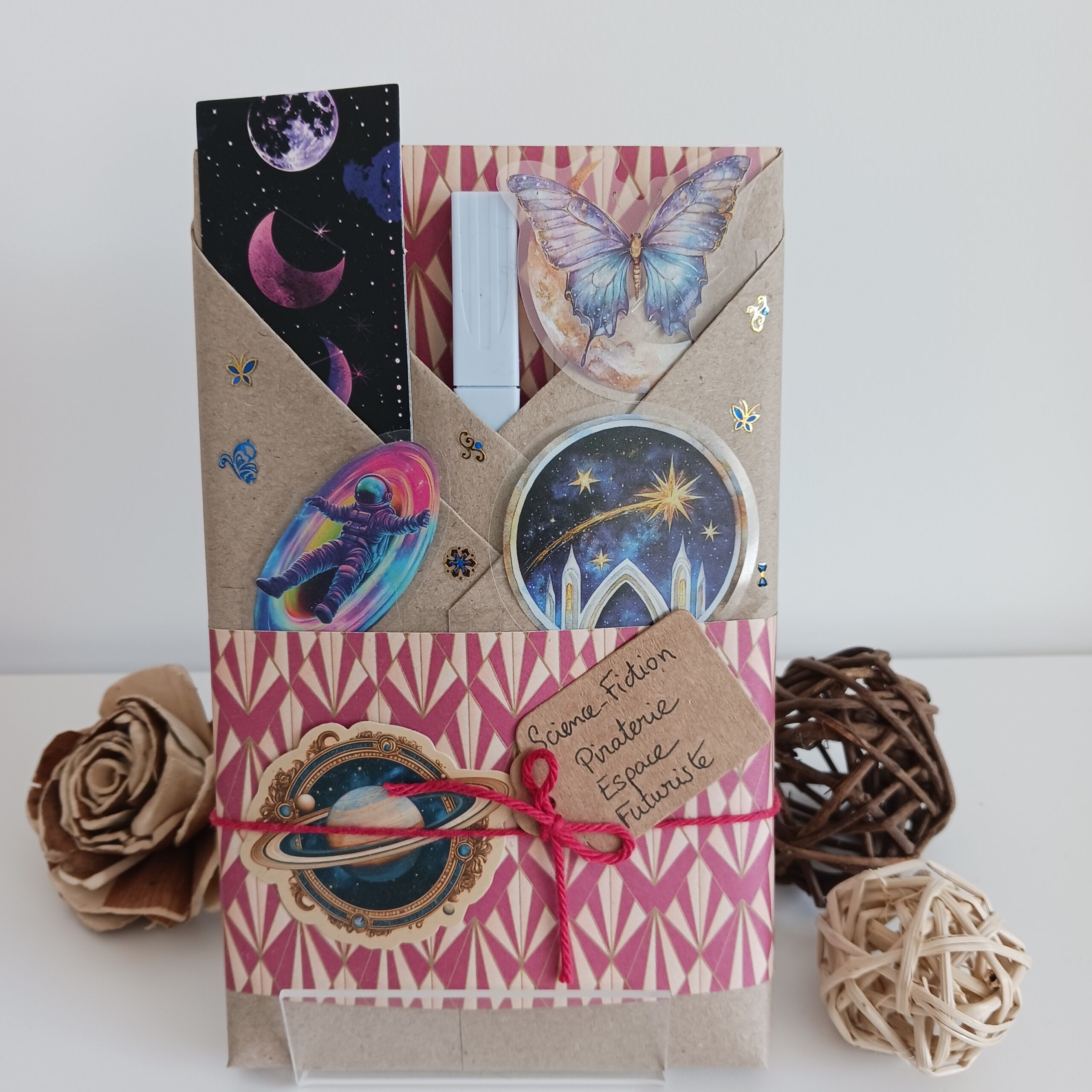 Un livre mystère format poche, son marque-page et ses accessoires livresques (stylo, crayon, surligneur, stickers, onglets adhésifs, carte… Variable selon la box)