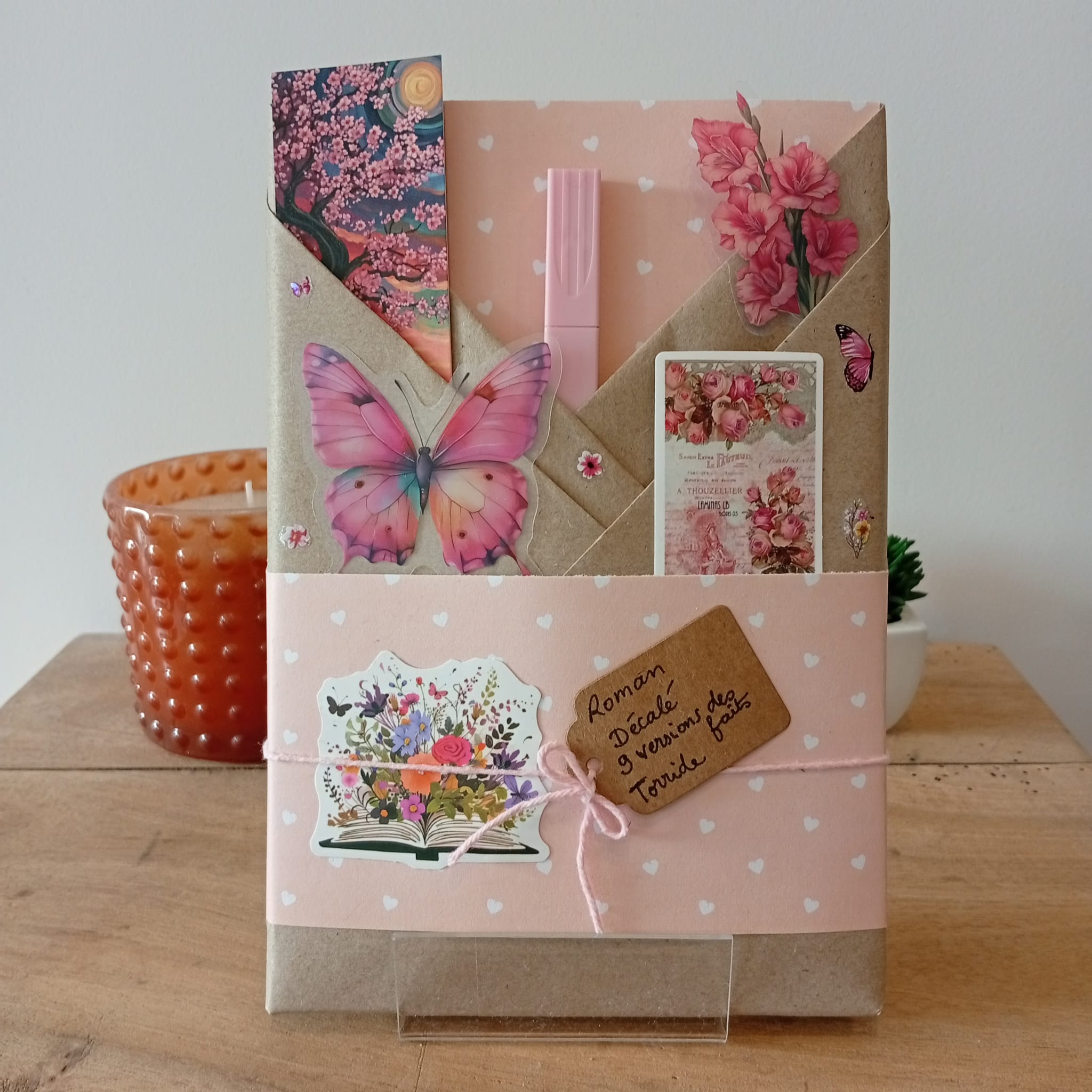 Un livre mystère format broché, son marque-page et ses accessoires livresques (stylo, crayon, surligneur, stickers, onglets adhésifs, carte… Variable selon la box)
