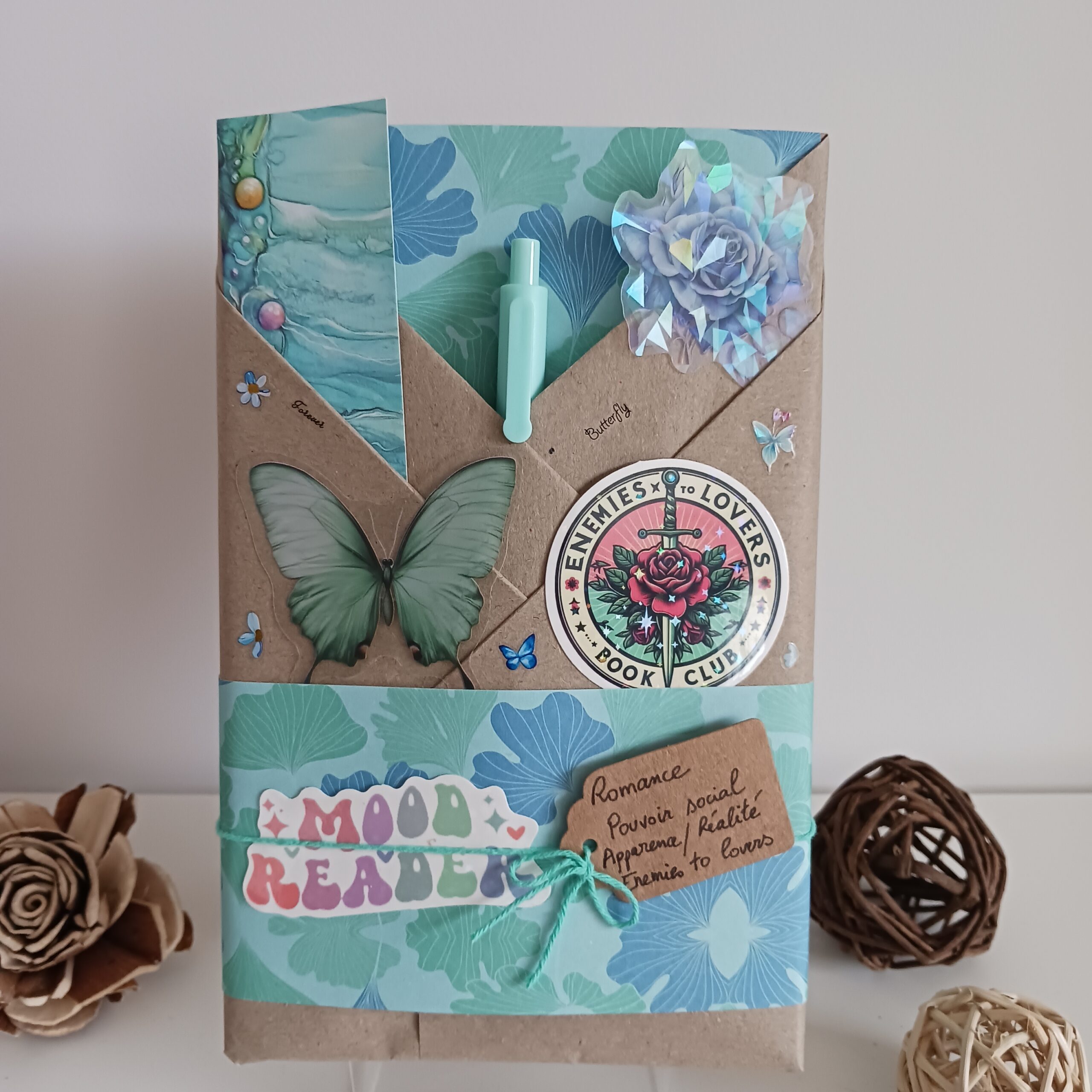 Un livre mystère format broché, son marque-page et ses accessoires livresques (stylo, crayon, surligneur, stickers, onglets adhésifs, carte… Variable selon la box)