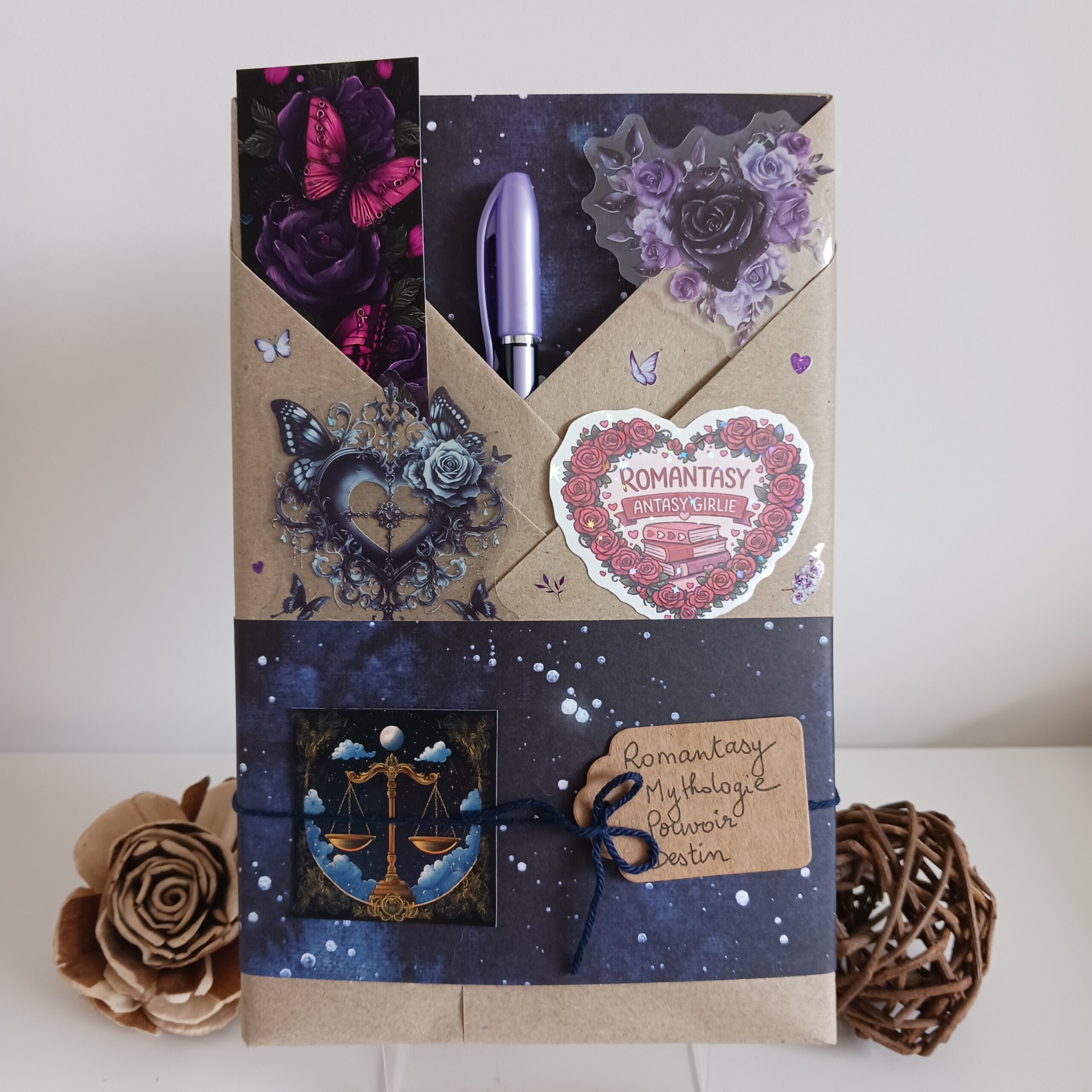 Un livre mystère format broché, son marque-page et ses accessoires livresques (stylo, crayon, surligneur, stickers, onglets adhésifs, carte… Variable selon la box)
