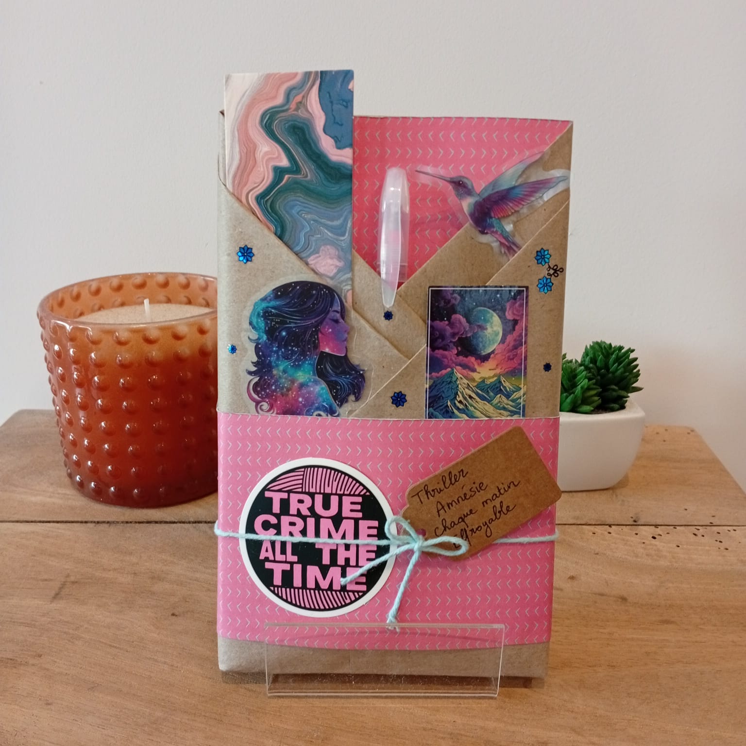 Un livre mystère format poche, son marque-page et ses accessoires livresques (stylo, crayon, surligneur, stickers, onglets adhésifs, carte… Variable selon la box)