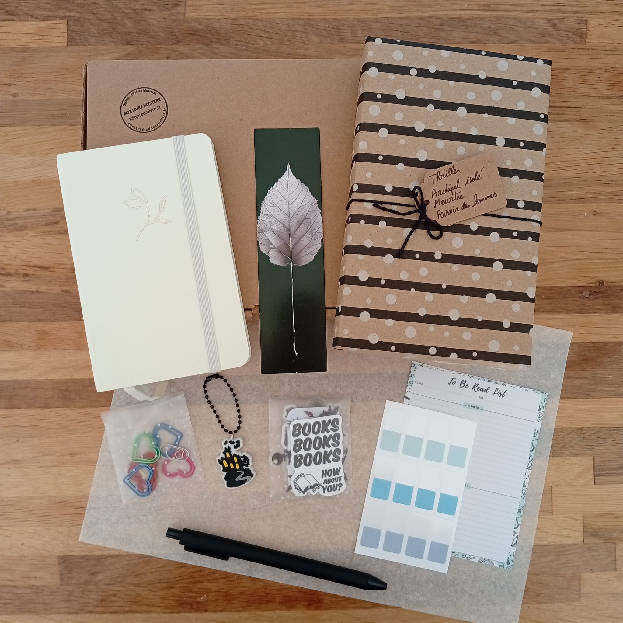 – Des accessoires livresques (stylo, crayon, surligneur, stickers, onglets adhésifs, cartes … Variable selon la box)