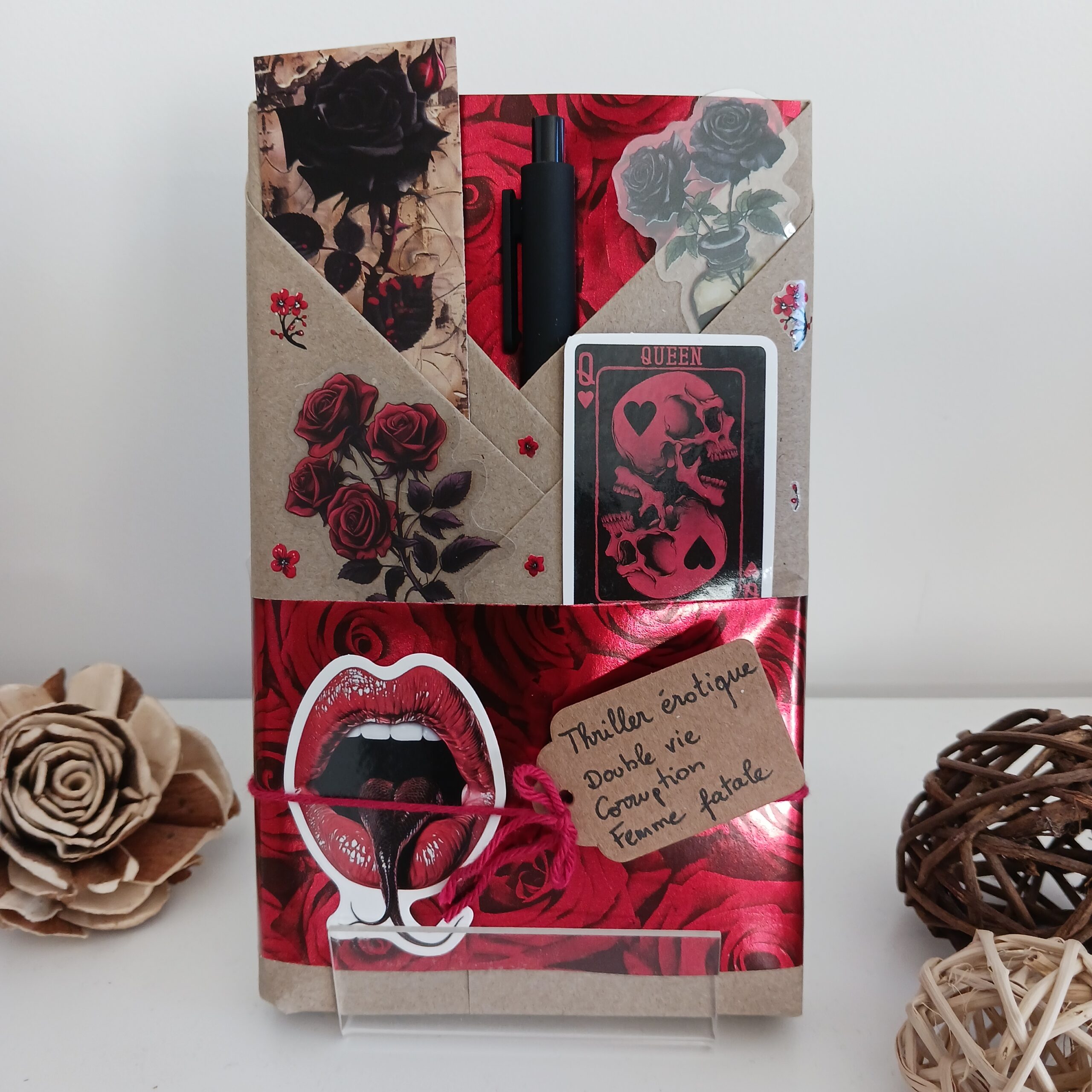 Un livre mystère format poche, son marque-page et ses accessoires livresques (stylo, crayon, surligneur, stickers, onglets adhésifs, carte… Variable selon la box)