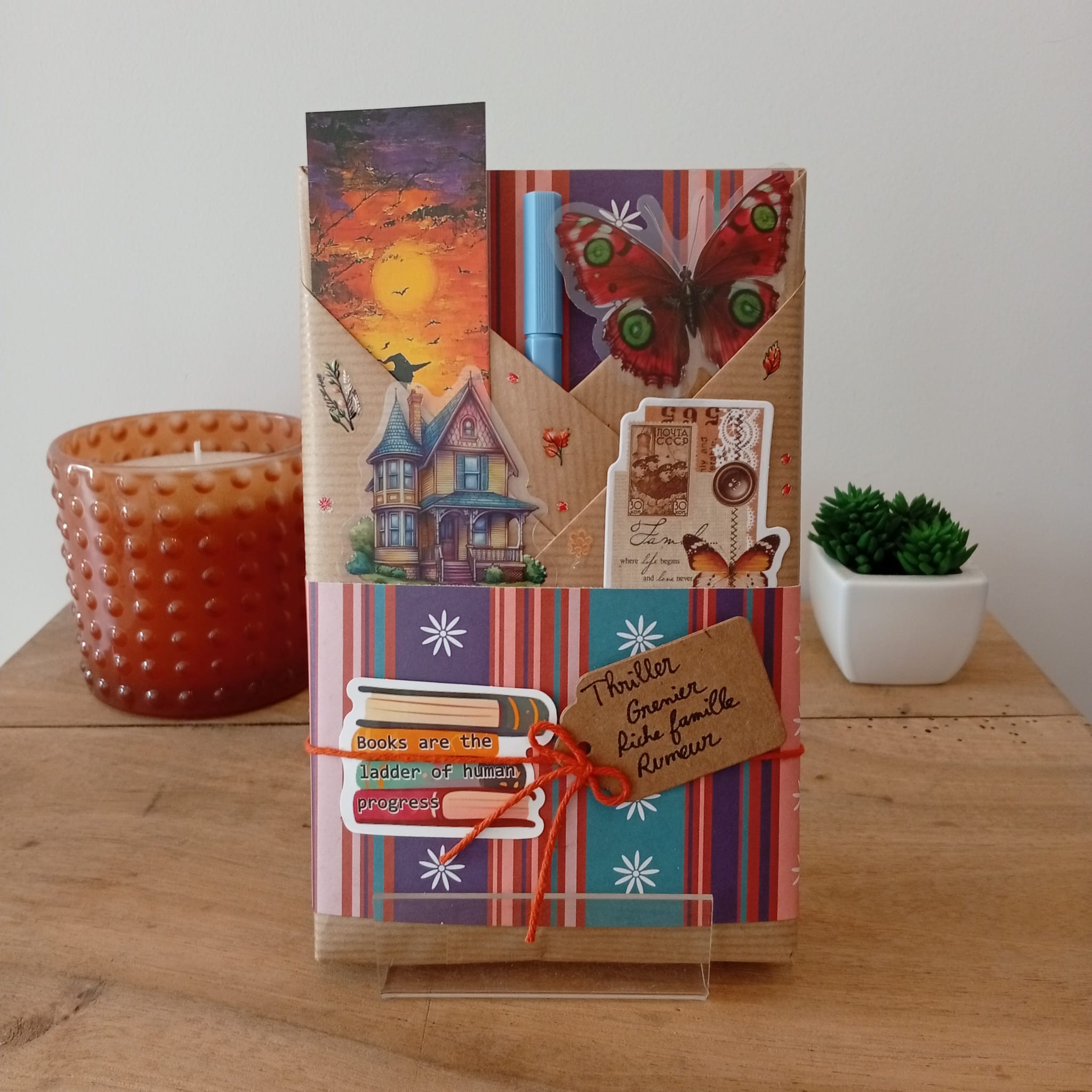 Box mystère : Un livre mystère format poche, son marque-page et ses accessoires livresques (stylo, crayon, surligneur, stickers, onglets adhésifs, carte… Variable selon la box)
